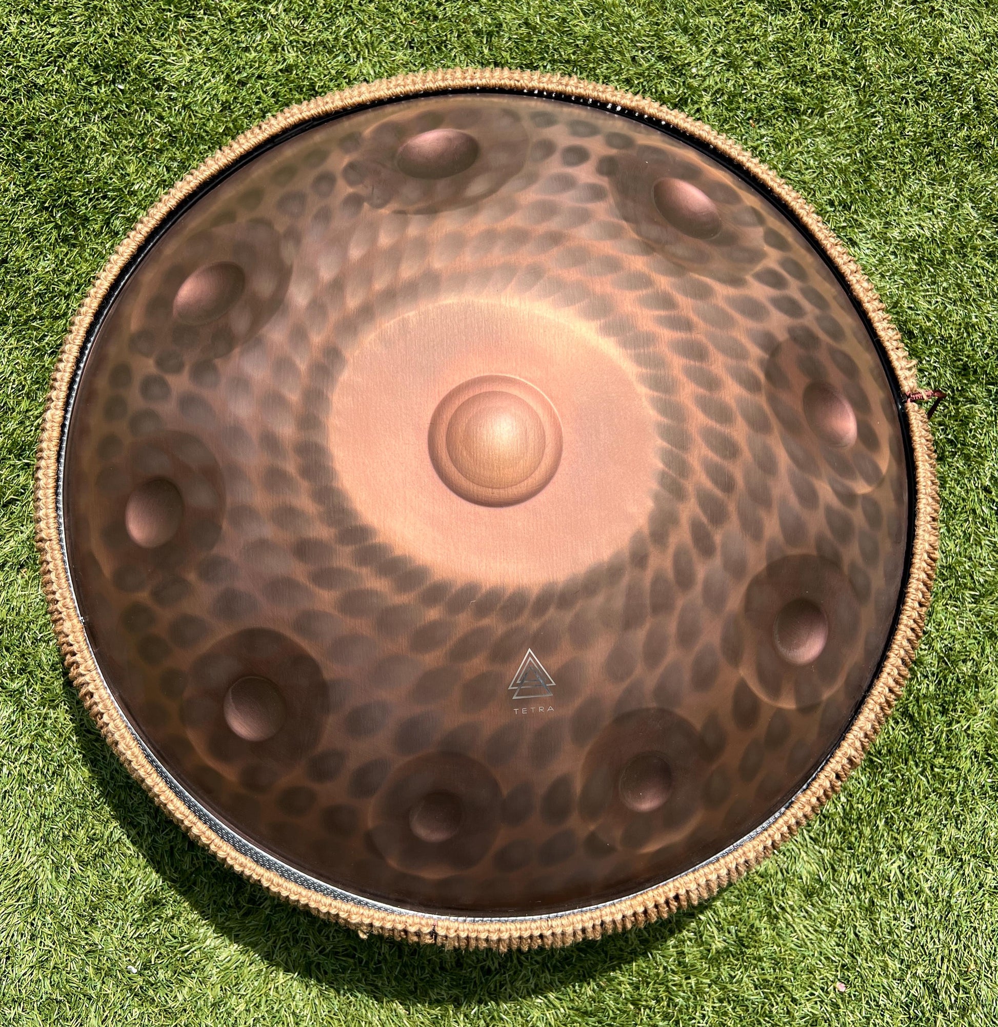 The handpan’s surface features a gorgeous bronze–rose–purple–gold–brown spectrum that shifts and glows under sunlight — making each instrument uniquely vibrant and full of character. A true visual masterpiece, as beautiful to look at as it is to play.